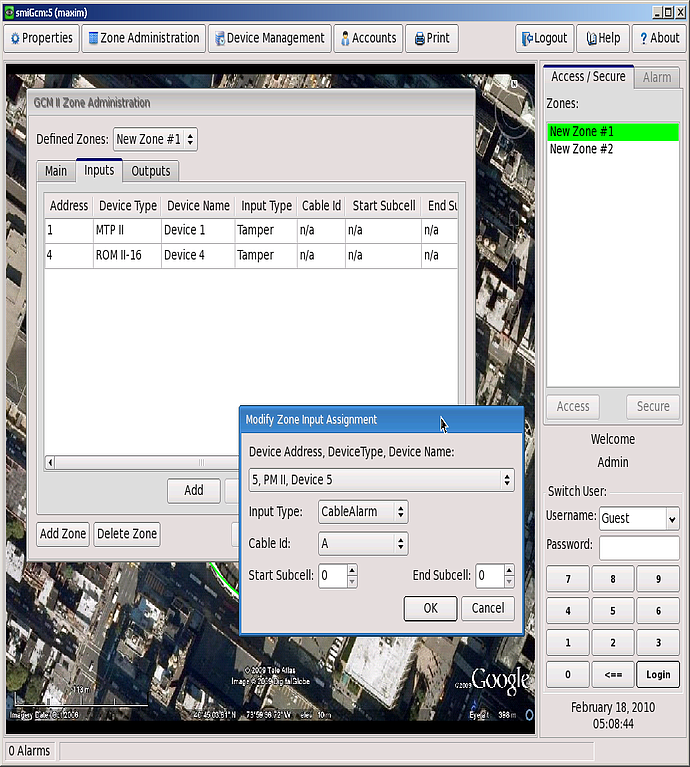 The GCM user interface communicated with the backend GCM daemon module to access and set information on security zones, devices, alarm states, and configuration parameters. The GCM performed real time monitoring of security zones with visual representation of current object status and generated a visual and sound alarm if security is breached. The GCM had an option to display and print reports of the alarms and system configuration settings history.